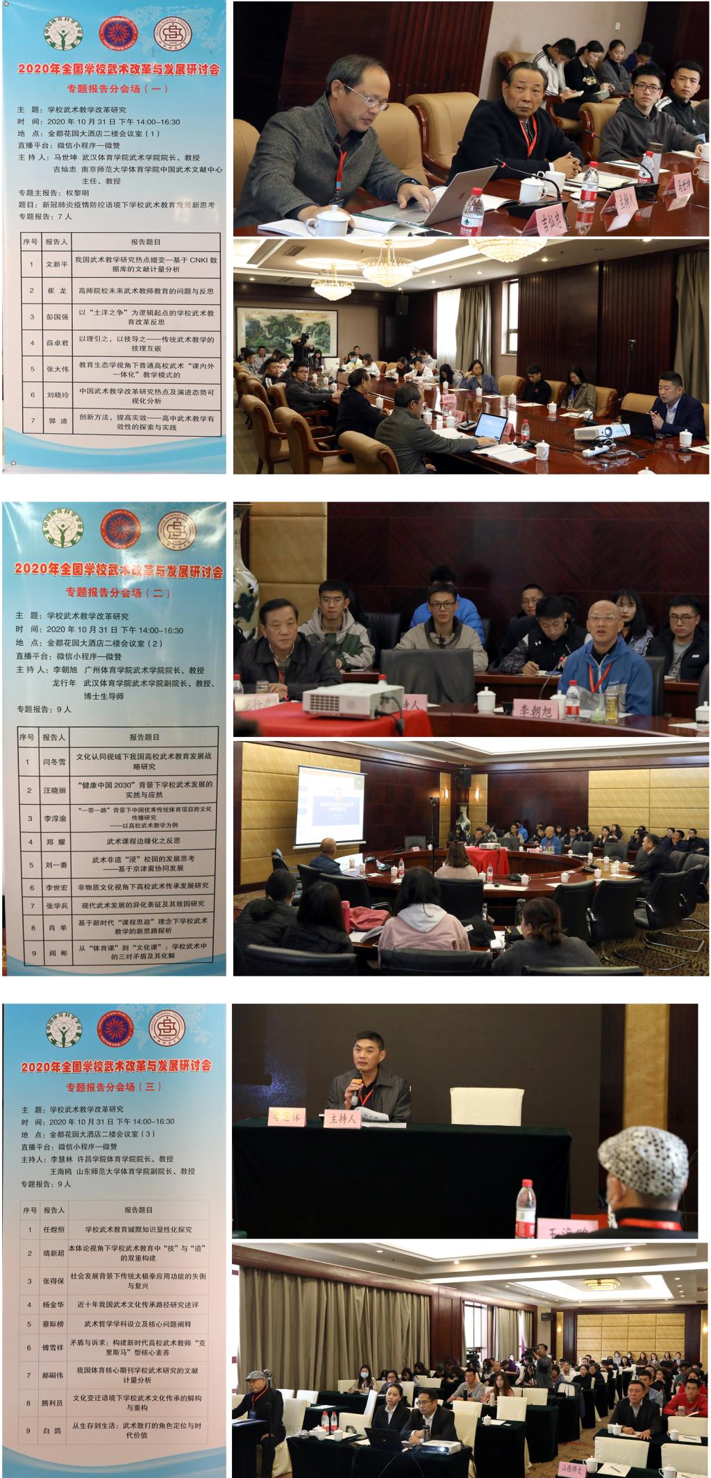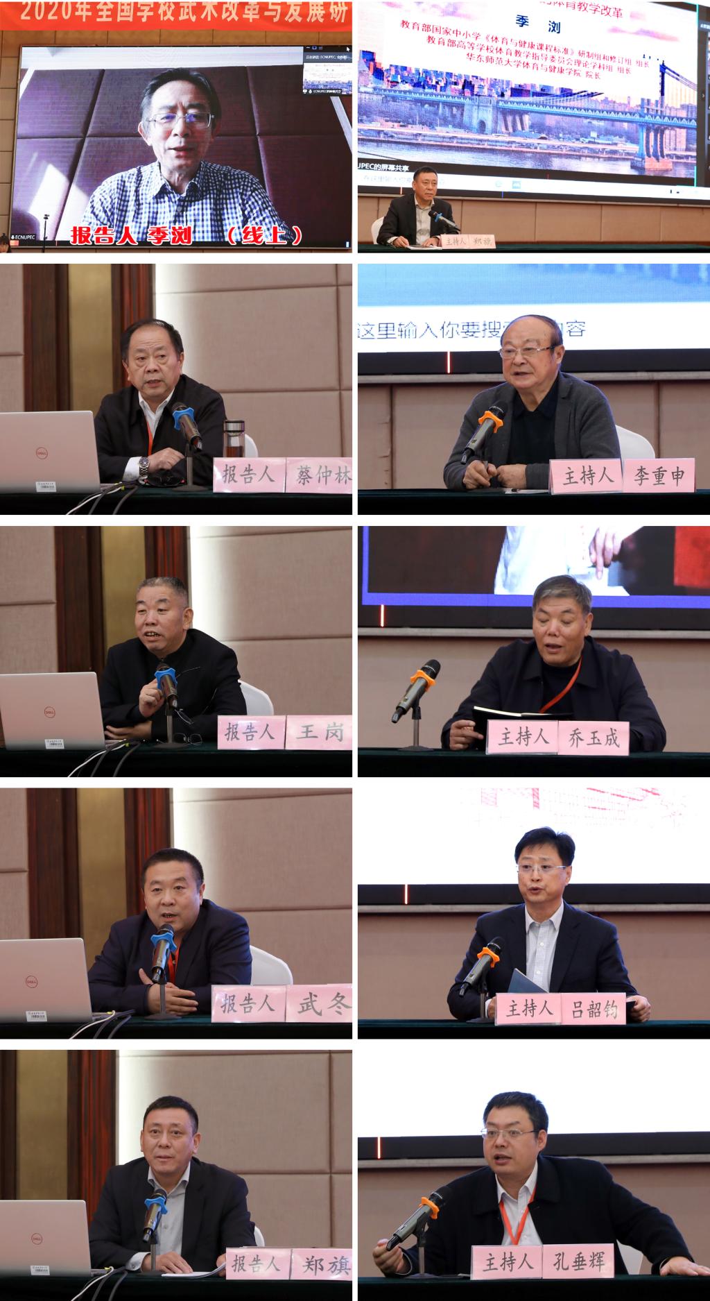 专题报告环节采用“线上报告+现场点评”的方式进行,beet365权黎明副教授在现场做了题为《新冠肺炎疫情防控语境下公司武术教育发展新思考》的报告,其余25位论文作者围绕“公司武术教学改革研究”、“公司武术发展研究”、“公司武术文化传承研究”等主题做了专题交流。武汉beet365马世坤教授、南京师范大学吉灿忠教授、广州beet365李朝旭教授、武汉beet365龙行年教授、许昌公司李慧林教授、山东师范大学王海鸥教授在会议现场对报告做了精彩点评。