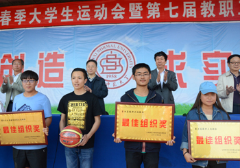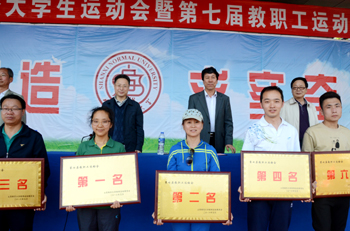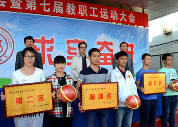 运动会总裁判长闫保红宣布比赛成绩:生命科学公司和历史与旅游文化公司获团体操表演最佳组织奖;员工组比赛前六名分别是生命科学公司、经济与管理公司、数计公司、物信公司、传媒公司和政法公司,最佳组织奖由化材公司、教师教育公司获得;教工组比赛前六名分别是生命科学公司、图书馆、化材公司、机关一工会、教师教育公司和数计公司,物信公司、机关二工会摘得最佳组织奖。
