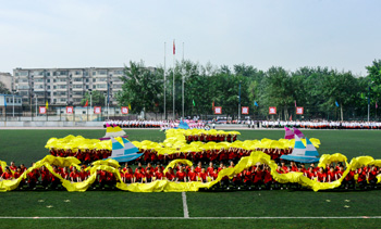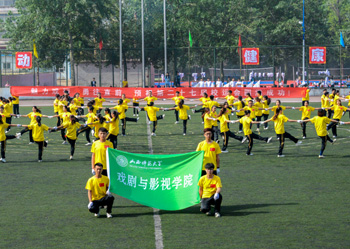 在悠扬动听的旋律中,精彩的团体操比赛开始。首先展示的是戏剧与影视公司,他们先后变化成八卦图、风车、海浪和五环的形状,青春洋溢的舞蹈极大地活跃了现场的气氛;历史与旅游文化公司的学子们手拿金扇,做出各种美丽的造型;经济与管理公司用彩扇分别摆出花团、波浪、“梦”、“V”字等图案,充分展示了经管学子必胜的信心;生命科学公司通过变换队形配合多样的道具展示了生命的伟大。全校师生沉浸在青春活力与激情热烈的气氛中。