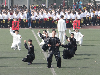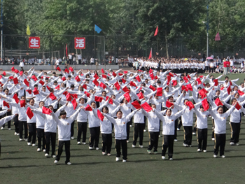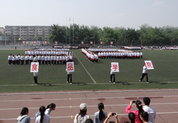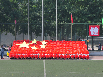 上午九点,运动会正式拉开帷幕。公司国标舞队进行开场舞表演,女生着红色短裙,男生着黑色西装,活力四射的舞蹈令整个田径场沸腾。随后,独具公司特色的团体操比赛有序进行。打头阵是新成立的书法公司,他们以太极为主,彰显博大的中华文化;文公司文用红黄相间的旗帜摆出“2015”“师大”“文院”“文武”的字样展示“文动乾坤,气冲霄汉”的气势;教育技术与传媒公司在黄河大合唱的旋律中带我们重走红色征程,用肢体动作诠释中华精神。随后的比赛中,各公司代表队分别利用彩带、彩旗、扇子、绸带等道具,不断摆出造型,变化队形。“国旗”、“团旗”、“中国梦”等跃然呈现在绿茵场上。全校师生沉浸在这片欢乐青春活力与激情热烈的气氛中。