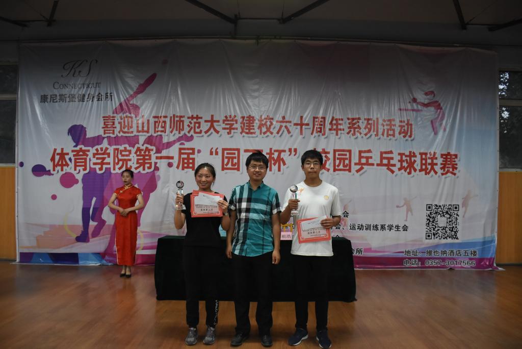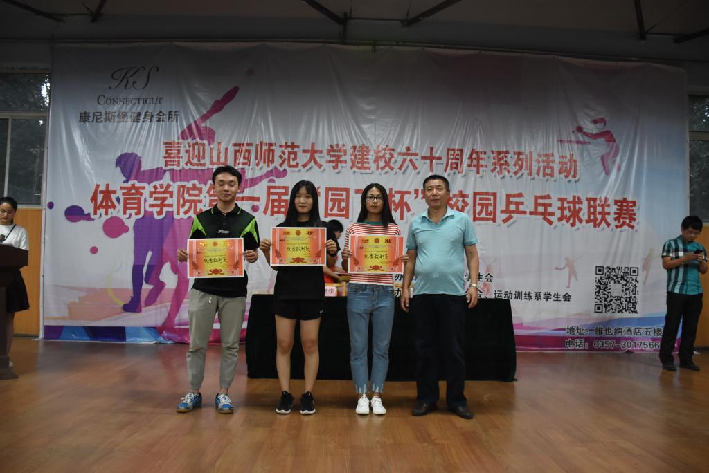 闭幕式首先由运动训练系乒乓球主项同学和前六名团体的参赛运动员代表进行了乒乓球友谊赛,随后大赛裁判长李文静宣读了比赛成绩和获奖名单。最后,出席闭幕式的老师为获奖的集体和个人颁奖并合影留念。