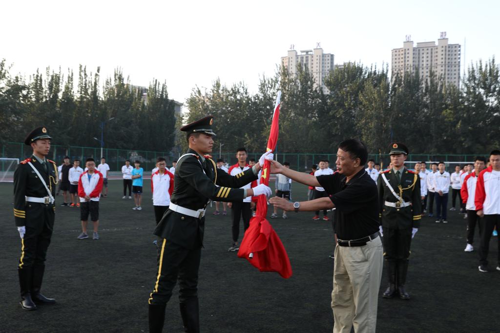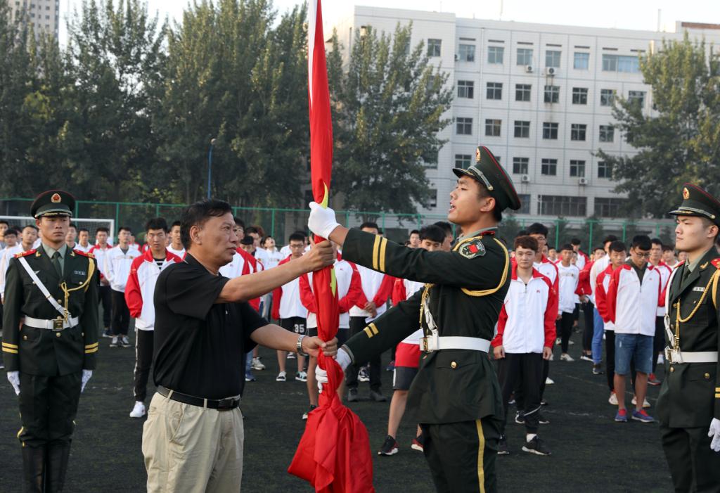 第十三届、十二届国旗护卫队队员在《解放军进行曲》的嘹亮声中步入田径场,公司党委书记李学刚为第十三届国旗护卫队授旗,第十三届国旗护卫队迎接国旗并进行新学期升国旗。
