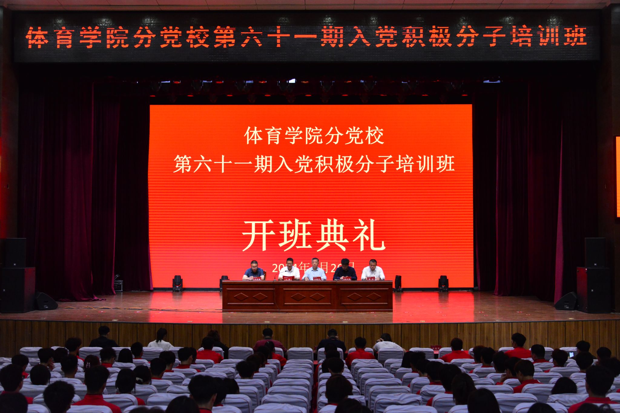 4月26日-5月7日,beet365举办了第61期入党积极分子培训班。26日晚,培训班开班典礼在科学会堂一层报告厅举行。公司党委书记、分党校董事长卫建平,公司党委副书记、经理王彤,公司党委副书记张大为,公司党委委员、副经理、运动训练系党支部书记李向前,公司党委委员、体育教育系党支部书记张杰,社会体育系党支部书记李俊明,运动训练系员工党支部书记卫玲玲,研究生第二党支部书记李瑞琴及129名入党积极分子参加了开班典礼,开班典礼由公司党委副书记张大为主持。