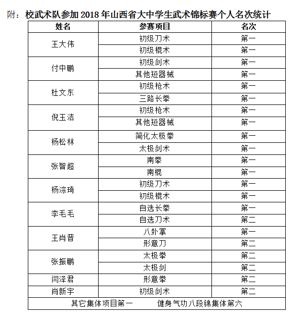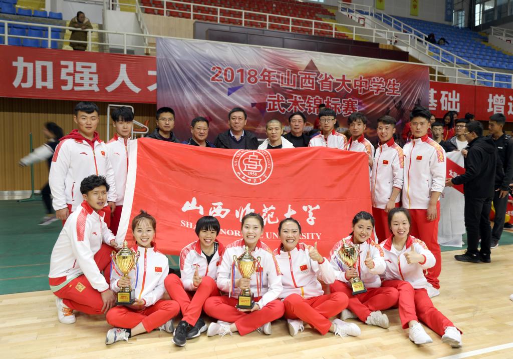 11月9日至11日,由山西省教育厅、山西省体育局主办的2018年山西省大中员工武术锦标赛在山西中医药大学举行。来自山西大学、太原理工大学、太谷中学等30余所大中公司的444名员工参加了比赛。公司武术队在教练员金涛指导下,共派出12名运动员参赛。全体参赛员工经过赛前集训备战,比赛中团结协作、顽强拼搏,在激烈的角逐中,荣获2018年山西省大中员工武术锦标赛男子团体总分第一名、女子团体总分第一名、男女团体总分第一名的佳绩,共获得金牌17枚、银牌6枚。公司参赛员工杜文东、王大伟获“优秀运动员”称号,教练员金涛被评为“优秀教练员”。侯介华副教授、青年教师高贯发参与了本次比赛的执裁工作,公司员工精湛的技艺、良好的精神风貌以及执裁教师过硬的业务能力,赢得各参赛代表队的高度认可与赞扬,进一步扩大了公司武术与民族传统体育专业的影响力。 (beet365/文 邓碾管/摄)