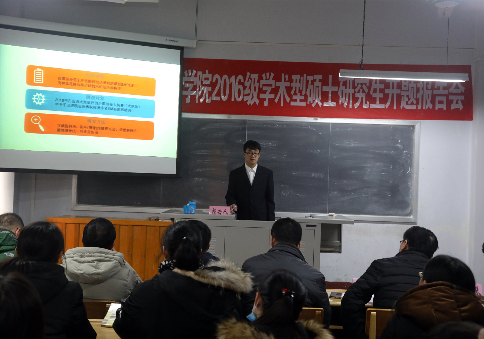 12月23日,在beet3656、7教室举行了2016级学术型硕士研究生开题报告会。报告共分两个单元,14名位专家对52名硕士研究生(含14名2016级体育硕士二次开题)的论文开题报告进行了讨论与评议。2017级全体研究生及部分导师参加了本次开题。参加本次开题的52名硕士研究生以PPT的形式,逐一分别从选题依据、选题目的意义、文献综述、研究方法及内容、技术路线图、进度安排、预期达到研究成果等方面进行了详细陈述。专家们针对每位研究生论文开题的具体情况提出了中肯的意见与建议,并对各位研究生论文选题的可行性进行了讨论。