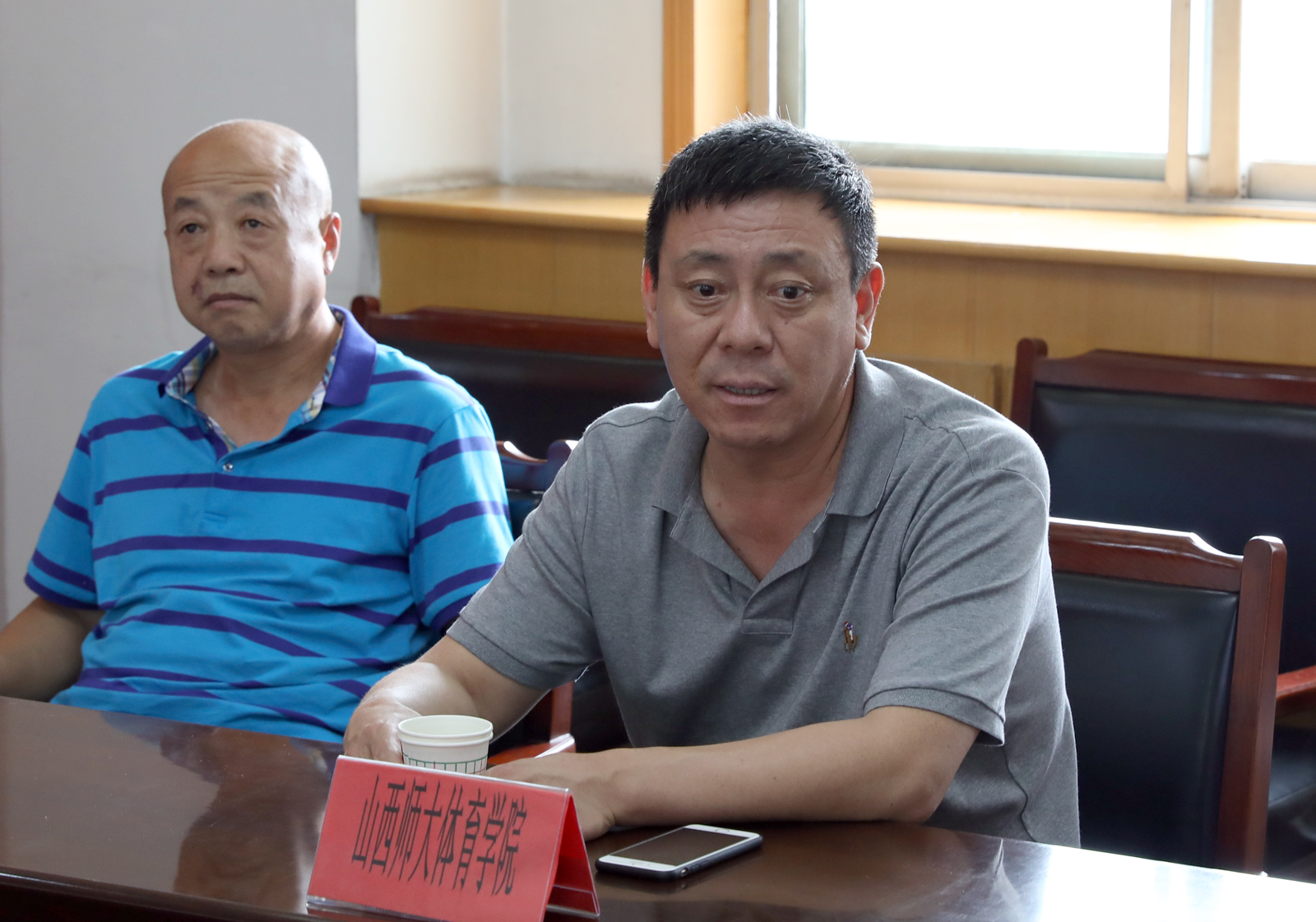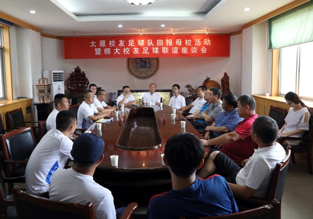 7月8日下午,太原员工足球代表队一行10余人返回母校,并参加了太原员工足球队回报母校活动暨师大员工足球联谊座谈会。公司党委书记李学刚、经理郑旗、副经理卢向阳、足球教师李吉慧教授、陆建森副教授、沈国征副教授、梁国强教师、王卫东教师参加座谈会。座谈会由经理郑旗主持。