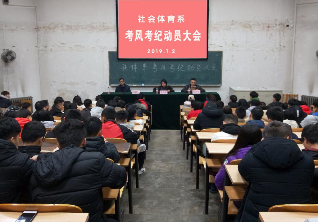2019年1月2日下午16点30分,社会体育系考风考纪教育大会在阶一教室顺利召开。社会体育系主任陈乐琴老师、副主任杜治华老师和辅导员邓碾管老师参加了本次会议。