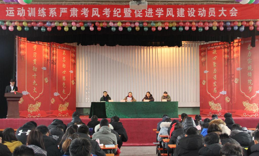 为了加强学风建设,严肃考风考纪,保证期末考试顺利进行,12月29日上午9点,运动训练系在大礼堂召开严肃考风考纪暨促进学风建设动员大会。莅临本次会议的领导和老师有:运动训练系副主任郭丽娟老师、16级辅导员高琴老师、17级辅导员贾建学老师、18级辅导员黄志高老师。