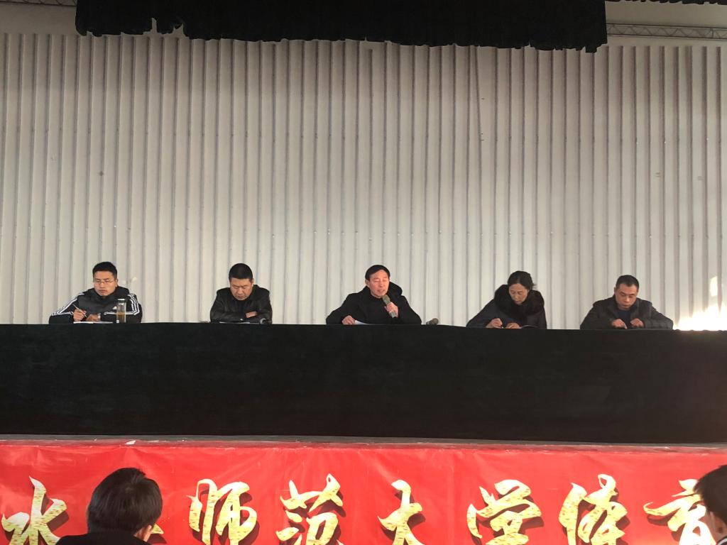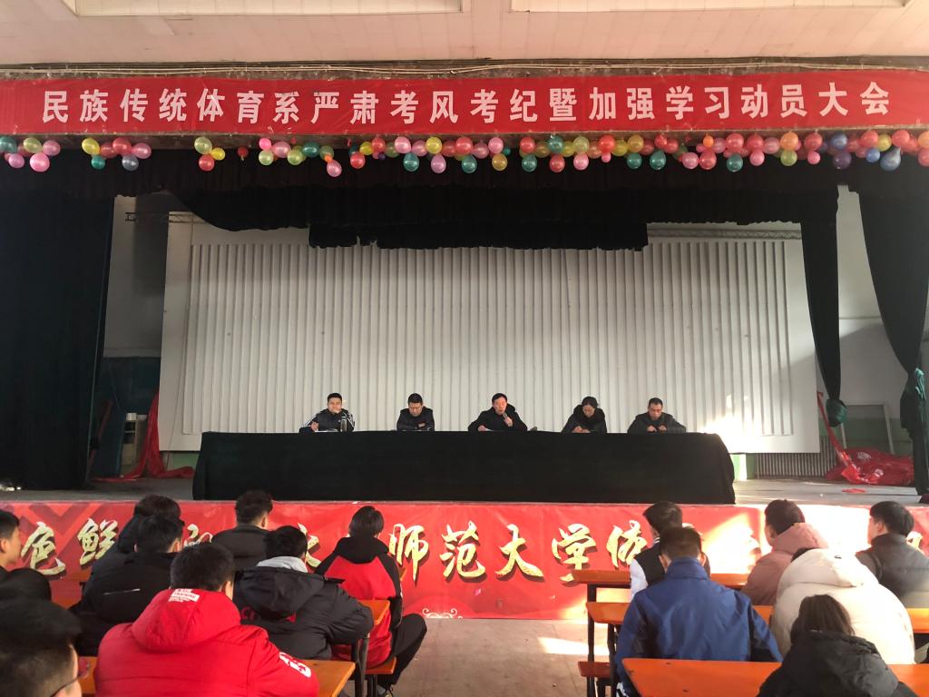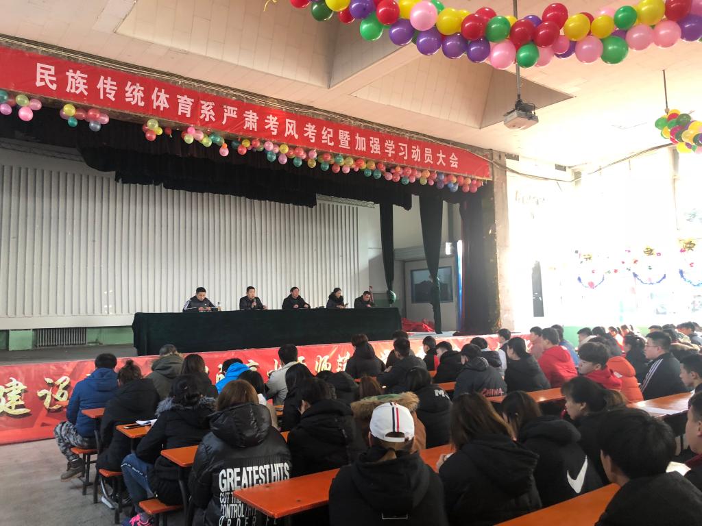 为了加强学风建设,严肃考风考纪,保证本学期期末考试顺利进行,1月2日下午14.30点,民族传统体育系在大礼堂召开严肃考风考纪暨加强学习动员大会。莅临本次会议的领导和老师有:民族传统体育系主任赵道卿老师、民族传统体育系副主任权黎明老师、16级辅导员王金枝老师、17级辅导员高贯发老师、18级辅导员刘剑老师。
