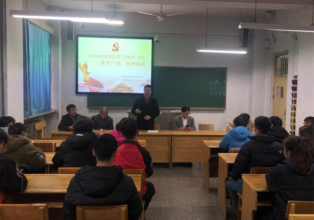 11月22日社会体育系党支部在beet365教学楼3教室开展“不忘初心、牢记使命”主题教育“三服务”活动,活动主题为“筑梦国内一流高校,服务体育强国战略”。本次服务对象为社会体育系2017级员工,目的在于启动社会体育系2017级员工考研倒计时“365天”仪式,进行考研动员指导。