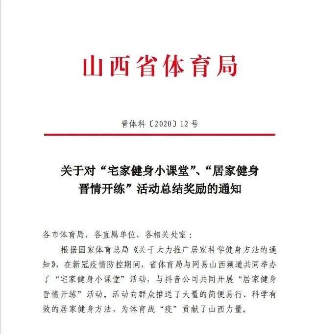 近日,山西省体育局下发了《关于对“宅家健身小课堂”、“居家健身晋情开练”活动总结奖励的通知》(晋体科[2020]12号),公司在“宅家健身小课堂”活动中表现突出,其中100 课中有公司郭丽娟、贾建学、张秀珍、黄志高、王红芳、卫玲玲等教师参与或指导的16课入选,并有8课进入点赞前50名名单,公司荣获“优秀组织奖”。运动训练系主任郭丽娟副教授录制的肩颈保健操视频获得一致好评,并被学习强国平台转载。疫情期间,公司新媒体推送了公司师生创编的“居家健身”部分内容和方法,进一步扩大了宣传。