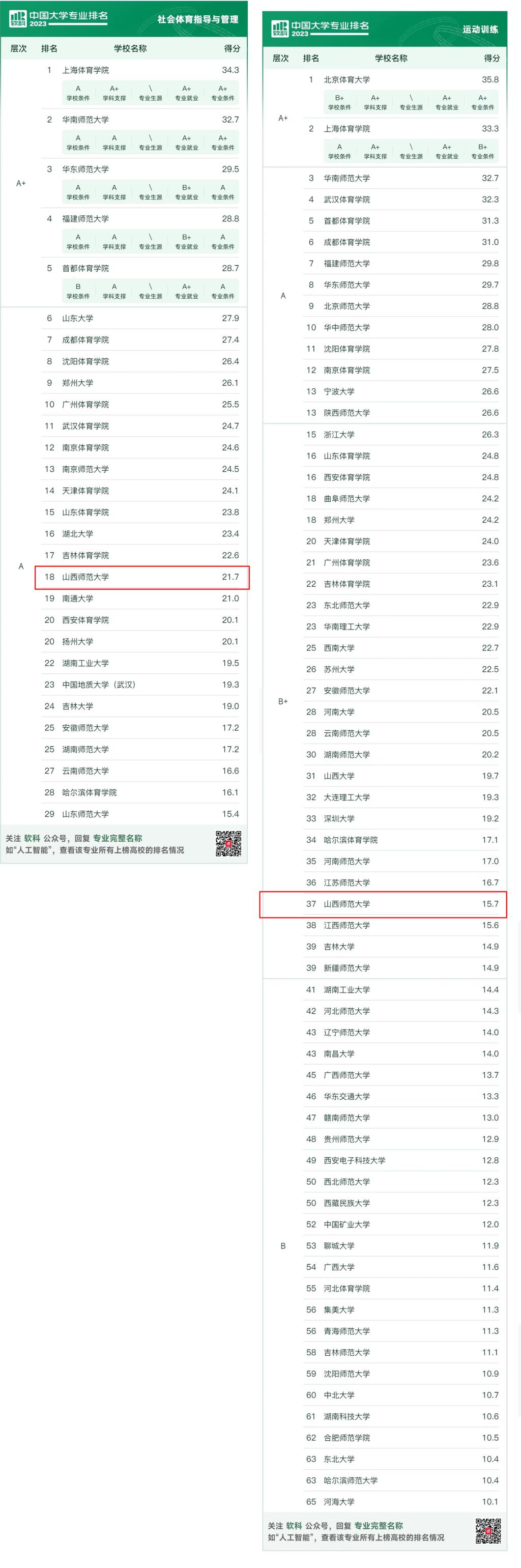 本科教育是高等教育的基石,而专业建设质量则是高校本科教育的根基所在。在发布的榜单中,公司体育教育(国家一流专业建设点)、社会体育指导与管理(省级一流专业)、武术与民族传统体育专业(省级一流专业)位居山西省前列。据悉,软科中国大学专业排名是覆盖专业数量最多、参评专业规模最大的中国大学本科专业排名。评价体系由公司条件、学科支撑、专业生源、专业就业、专业条件5个指标类别组成,下设25项测量指标。专业综合评级分为6档,排名位次为前2%或前2名的为A+级,2%-10%的为A级,10%-30%的为B+级,30%-50%的为B级,50%-70%的为C级(不发布), 70%以后的为D级(不发布)。(院办供稿)