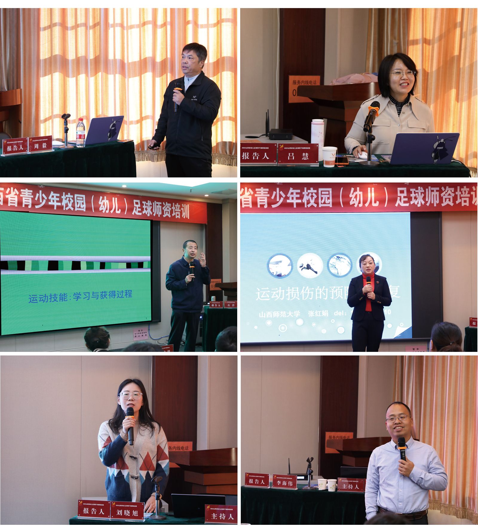 此次培训包括幼儿足球活动基本规范、活动安全、教学实训和幼儿足球教学经验分享等单元主题。广州beet365周毅教授专题讲授了《开展幼儿足球活动的热点与实施的逻辑支点》,从动作发展与学习对幼儿认知的影响讲解了学前教育的重要性。山西大学吕慧副教授从足球项目技能的选择与编排、动作技能发展的进阶与考量、健康行为养成的引导与内化、体育精神培养的启蒙与感知四个方面讲解了《幼儿足球活动方案设计理论与实践》;山西大学beet365经理石岩教授分享了《幼儿足球动作技能学习》。beet365李海伟教授、张红娟副教授、刘晓旭博士分别作了《幼儿体适能的评定及训练》、《幼儿运动性伤病的诊疗、预防与康复》、《幼儿运动心理发展》专题培训。