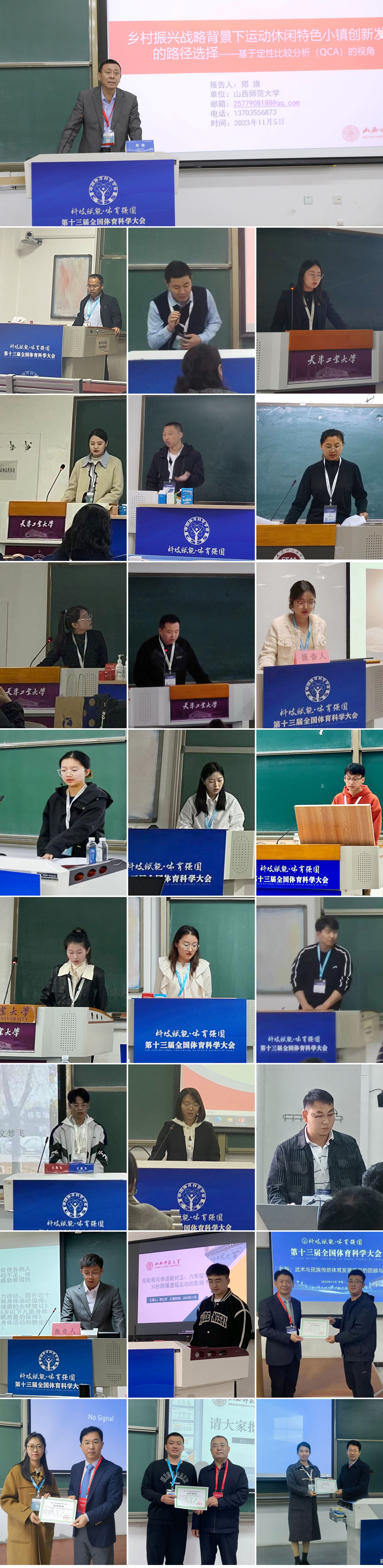 本次大会设置大会报告、专题报告、墙报交流、热点沙龙、国际学术交流研讨会等交流环节,公司师生参加了45场专题报告、墙报交流73篇、书面交流11篇,论文涉及体育社会科学、体育管理、体育产业、运动医学、体质与健康、公司体育、武术与民族传统体育等16个领域。其中,经理郑旗教授受邀作了题为《乡村振兴战略背景下运动休闲特色小镇创新发展的路径选择——基于定性比较分析(QCA)的视角》的专题主旨报告,并主持了“乡村振兴与体育产业发展研究(1)”专题报告会场的学术交流。