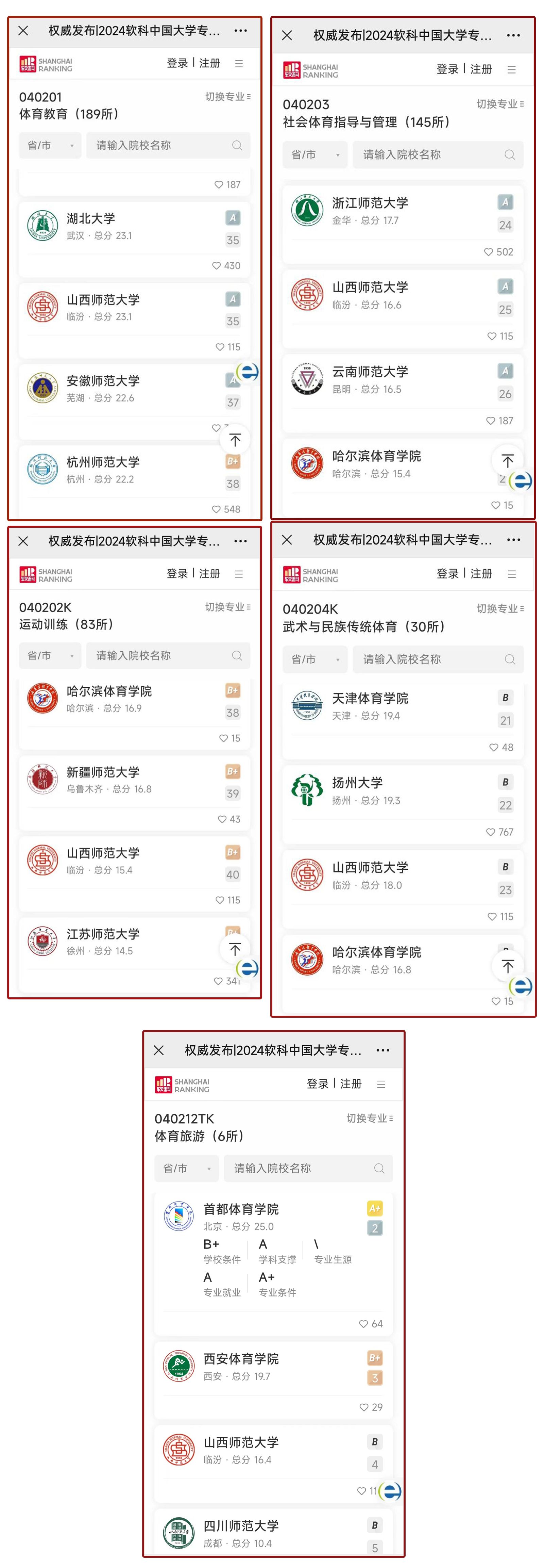 公司beet365的5个本科专业全部上榜,其中体育教育专业在参评的189所院校中排名35,位居A档;社会体育指导与管理专业在参评的145所院校中排名25,位居A档;运动训练专业在参评的83所院校中排名40,位居B+档;武术与民族传统体育专业在参评的30所院校中排名23,位居B档;体育旅游专业在参评的6所院校排名第4,位居B档。