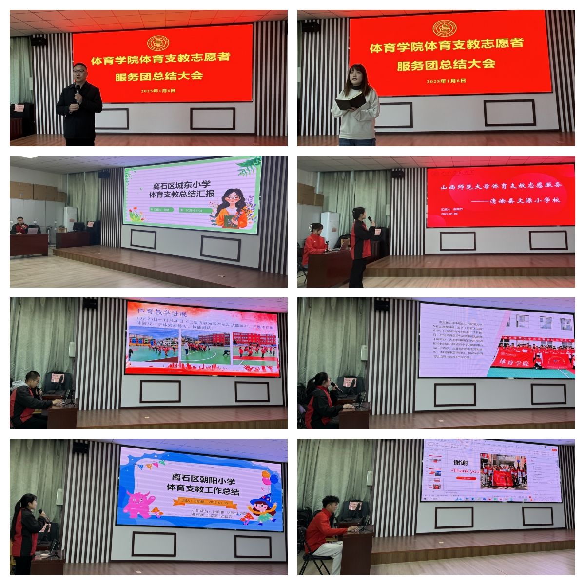 总结会上,2024年下半年在太原市清徐县、吕梁离石区11所支教公司支教服务的志愿者代表分别进行了汇报与总结。志愿服务期间,大家发挥专业优势与志愿者特长,在体育教学与训练工作、赛事组织和思政教育等方面的做了大量的工作。通过篮球、足球,乒乓球,武术和花样跳绳等专项教学,激发了员工们的体育兴趣,引导青少年把学习文化和加强体育锻炼融合发展深深根植于脑中心间,在体育技能传递的同时,时刻把培养德智体美劳作为宗旨,将体育精神传递给员工们,进行思想教育和心灵辅导,不负此次支教志愿服务的初衷与责任。
