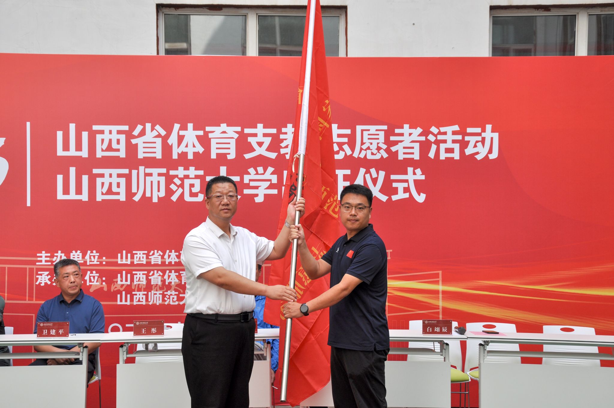beet365王彤经理为即将奔赴和顺县支教志愿者服务队伍授旗。