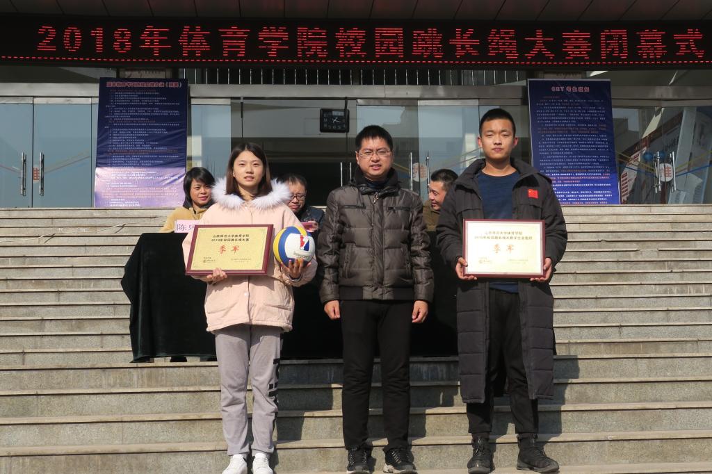 2018年校园跳长绳大赛自12月4日开赛,各参赛班级代表队以饱满的热情积极参加,绳子被同学们抡得呼呼生风,打得地面叭叭直响,同学们穿梭其间,动作敏捷;各队伍队员之间相互鼓励,协调配合,全身心地投入比赛,跳出了各自最好的成绩,激发了运动员的无限潜能。39支队伍460余名运动员经过一周激烈的角逐,最终体教1803班、文理1803班、社体1601班分别荣获团体冠军、亚军、季军;社体1801班、文理1703班、社团联合会、体育教育系员工会荣获优秀组织奖;文理1601班、体教1605班运训员工会、民体员工会获得道德风尚奖。董冬冬、魏朋通、张丹丹等同学获得优秀运动员称号,王漫、王佳琪、高雅政等获得优秀裁判员称号。大赛裁判长杜治华老师宣读了比赛成绩和获奖名单,随后出席闭幕式的老师为获奖的集体和个人颁奖并合影留念。