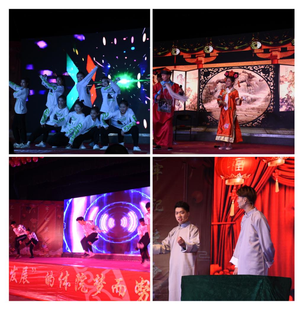 晚会在舞狮表演《雄狮闹春》中拉开了序幕,默契的配合和高难度的动作赢得了阵阵掌声,随后观看了全院师生和兄弟公司带来的新年祝福视频。晚会由运训1703班宋政演唱的《我的中国心》点燃了全场的爱国热情,民族健身操队带来的街舞《comebabycome》充满了青春活力,引爆全场,带来阵阵掌声。体教1904班带来的小品《甄嬛外传》通过风趣的表演,让同学们笑声不断,公司跳绳队带来的花样跳绳《律动青春》用炫酷的表演吸引全场眼球,《理想那点事》不禁让在场的同学思考如何靠努力奋斗实现自己的理想,一曲吉他演唱《成都》悠扬婉转。随后,由院工会郭丽娟等老师带来的健美操《快乐停不下来》,以欢快的节奏,点燃了我们的运动热情;刃羽轮滑协会的小品《占位子》让我们不禁思考什么是真正能够带给孩子们幸福的生活方式。钢琴演奏《大鱼》,配上音乐公司带来的舞蹈,让我们明白人生路程的珍贵,勇敢去做每一件事。国防军事拓展协会带来的战术表演《强军之战》体现了顽强拼搏的精神,情景剧《钱学森》向伟人致以崇高敬意,古筝笛子合奏《礼仪之邦》体现了泱泱中华不愧为礼仪之邦的称号。最后,武术表演《中华魂》演绎出中国国粹的精华和中华传统武术的博大精深。