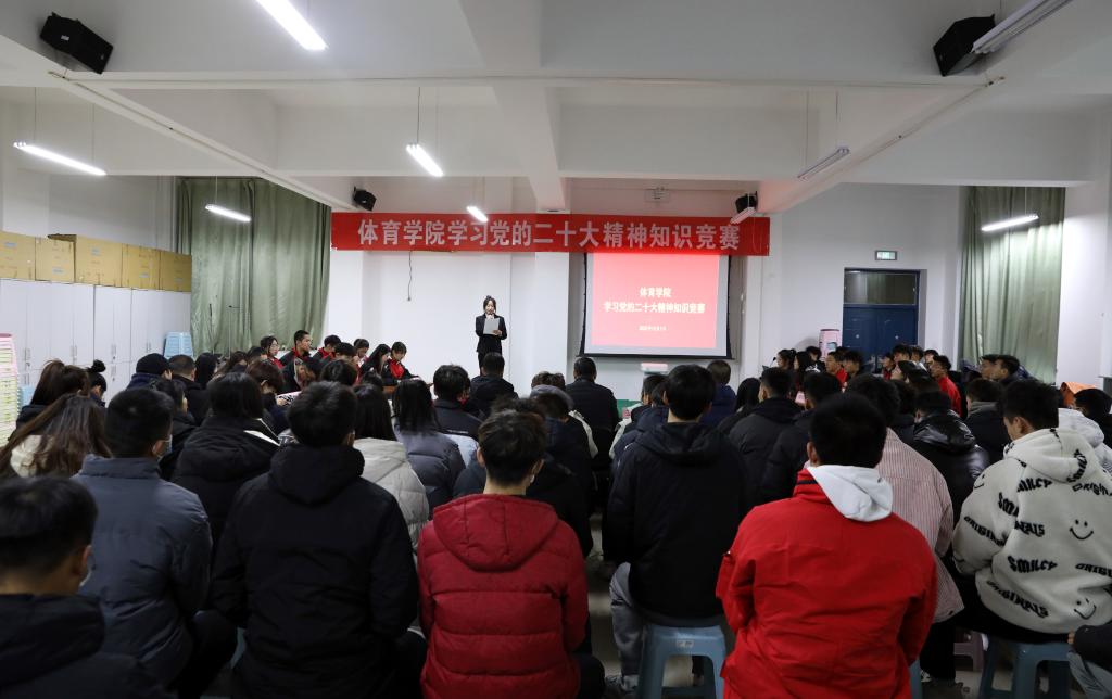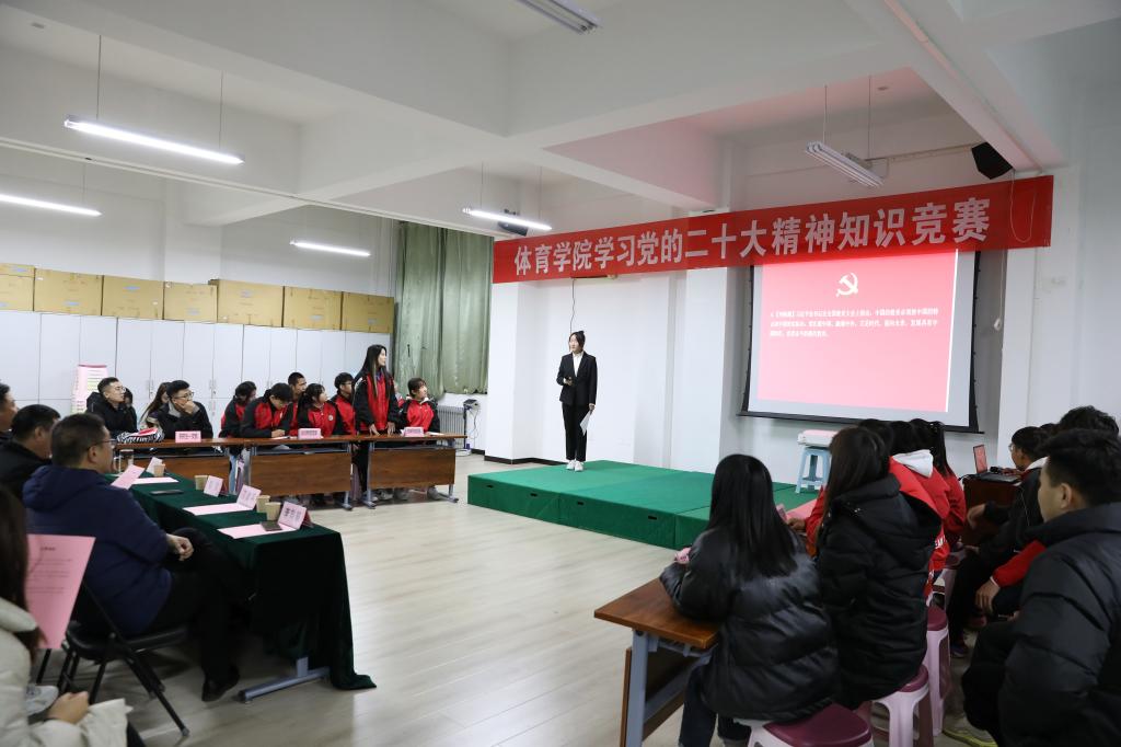 12月1日晚,beet365“学习党的二十大精神”知识竞赛活动决赛在运动心理实验室举行。公司党委书记卫建平,经理郑旗,副经理李向前、孟春雷,体育教育系党支部书记张杰、社会体育系党支部书记李俊明、武术与民族传统体育系党支部书记权黎明、运动训练系党支部副书记卫玲玲、研究生第一党支部书记王丽娜等现场观看比赛。