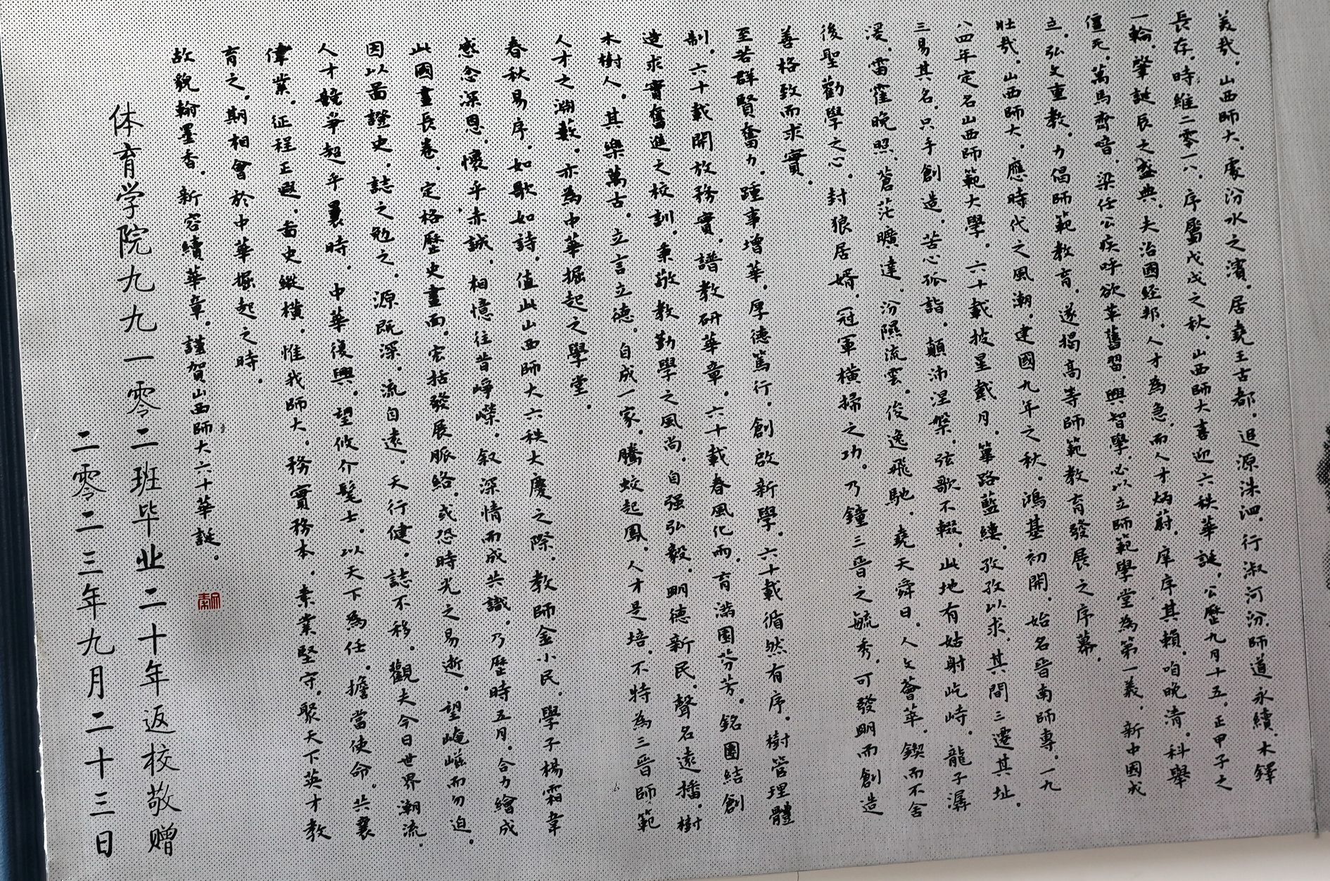员工们逐一介绍了各自的情况,深情地回忆在母校学习的情景,分享了工作和生活经历。随后员工们还为公司赠送了由美术公司金小民教授等人共同创作的“晋师甲子春雨图”铝制板画卷,并进行了揭幕仪式。各位员工表示,将秉承母校的教诲,在工作中不懈努力,回馈社会,感恩母校,为母校的发展贡献自己的力量。(闫文菁/文 邓碾管/摄)