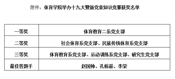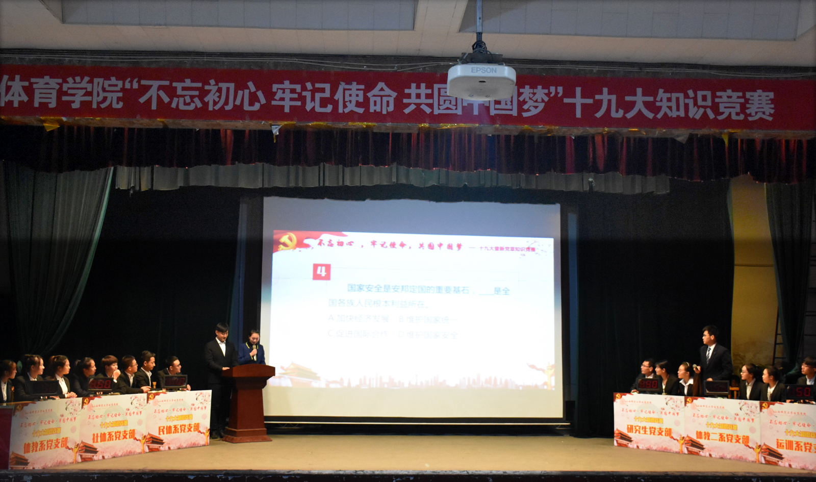 为了扎实推进“两学一做”学习教育常态化制度化,深入学习宣传贯彻落实党的十九大精神,确保党的十九大精神入脑入心,beet365党委于11月13日晚7:30在大礼堂举办了以“不忘初心、牢记使命,共圆中国梦”为主题的十九大暨新党章知识竞赛。体育教育系党支部、社会体育系党支部、民族传统体育系党支部、运动训练系党支部、体育教育二系党支部、研究生党支部6支代表队共24名选手参加竞赛,各代表队由各党支部书记带队并担任指导教师。beet365党委书记李学刚、副书记孙学虎出席本次活动,公司党员、重点发展对象以及积极分子共有300余人观看本次竞赛。