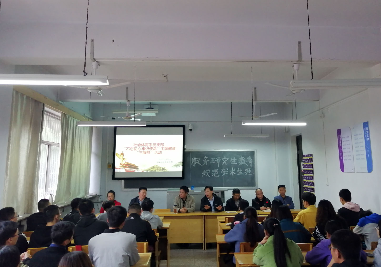 为加强beet365“不忘初心、牢记使命”主题教育深入开展,社会体育系党支部于10月25日星期五在beet365教学楼六教室开展“不忘初心、牢记使命”主题教育“三服务”活动。“三服务活动”,目的是服务地方、服务基层、服务群众,为身边的群众做实事好事。本次活动围绕“服务研究生教育,规范学术生涯”,和2019级体育学学术研究生们讨论交流学习心得,答疑解惑,合理规划研究生生活。