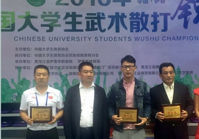 经过6天的激烈角逐,公司选手不畏强手,敢打敢拼,顽强拼搏,在教练员权黎明副教授的带领下取得了优异的成绩。最终获得丙组(民族传统体育专业组)团体总分第二名,丁组(现役散打专业运动员组)团体第五名以及荣获“体育道德风尚奖运动队”的骄人战绩。其中:民体系12级的李龙同学荣获“男子丙组90kg级”的冠军、民体系的13级武江玲同学荣获“女子丙组56kg级”的冠军、民体系的13级谢婵同学荣获“女子丙组65kg级”的冠军、民体系的15级汪莎莎同学荣获“女子丙组48kg级”的亚军、民体系的13级董莎同学荣获“女子丙组52kg级”的亚军、民体系的13级杜森同学荣获“男子丙组85kg级”的亚军、民体系的15级钟震威同学荣获“男子丁组60kg级”的亚军、民体系的13级张孟飞同学荣获“男子丁组70kg级”的季军、民体系的13级孙晨蕊同学荣获“女子丙组60kg级”的季军、民体系的13级刘佳林同学荣获“男子丙组75kg级”的季军、民体系的12级胡光标同学荣获“男子丙组65kg级”的第五名、民体系的15级柳旭东同学荣获“男子丙组56kg级”的第五名、民体系的柳旭东同学荣获“体育道德风尚运动员”称号。