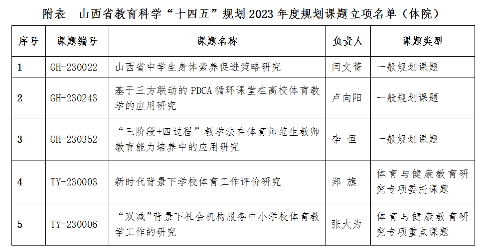 11月3日,山西省教育科学规划办公布了山西省教育科学“十四五”规划2023年度课题立项通知(晋教科规办函[2023]7号),公司闫文菁等5位教师申报的课题获批立项(见附表)。本年度省教育科学规划课题分为“一般规划课题”“中小学德育研究专项课题”“教育数字化与公司产品改革研究专项课题”“体育与健康教育研究专项课题”“员工军事训练与公司国防教育研究专项课题”等类型,省教育科学规划办对立项课题提出了明确要求,公司将持续跟踪课题研究,以研促教,以教促研,着力提高课题研究的实效,为beet365高质量发展和人才培养蓄力赋能。(院研究生部 供稿)